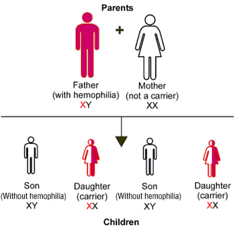When the father has Hemophilia but the mother does not, none of the sons will have Hemophilia. All of the daughters will carry the Hemophilia gene.