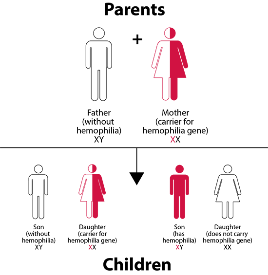 - For each child of both male and female gender, there will be a 50% chance of inheriting the affected X chromosome from the mother. In the case of a son inheriting the affected chromosome, he will have Hemophilia. In the case of a daughter inheriting the affected chromosome, she will become a carrier for the Hemophilia gene.